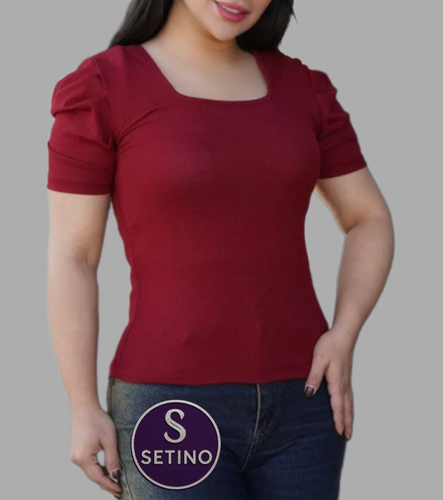 تیشرت زنانه یقه خشتی طرح آستین پف کبریتی